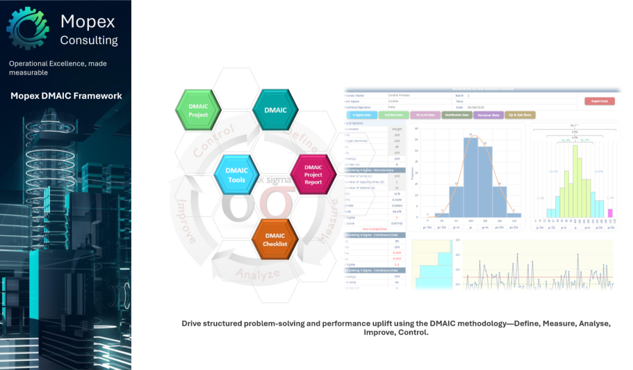 Drive structured problem-solving and performance uplift using the DMAIC methodology—Define, Measure, Analyse, Improve, Control.