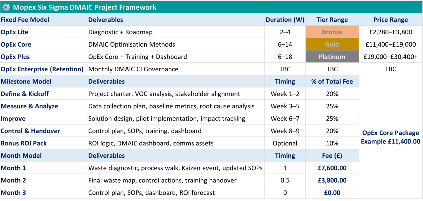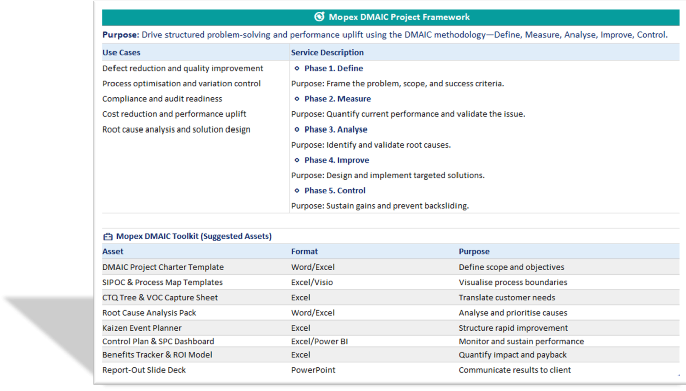 Mopex Frameworks break projects into clear, trackable phases, whether guided by a Mopex consultant collaborating with the client or handled directly by the client using their own Mopex DMAIC Framework package.