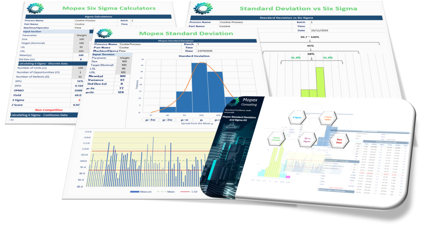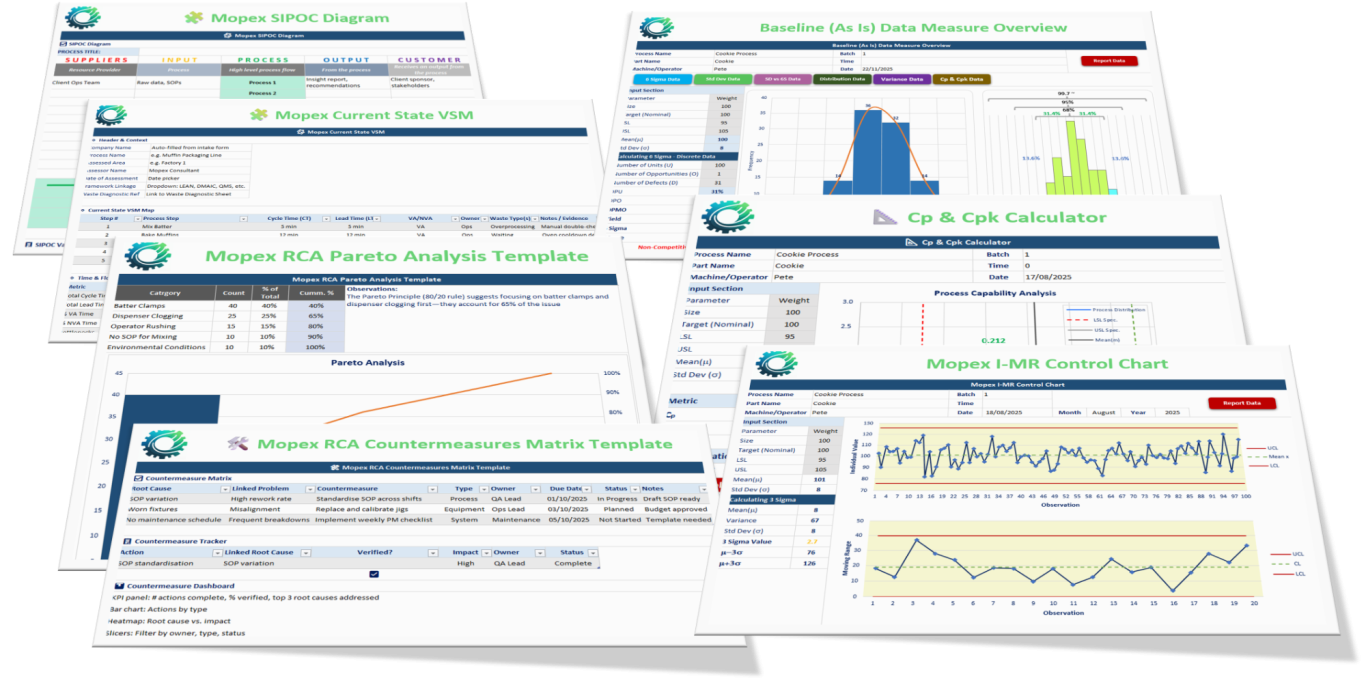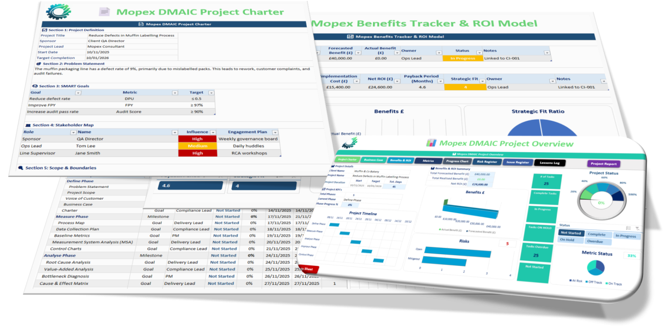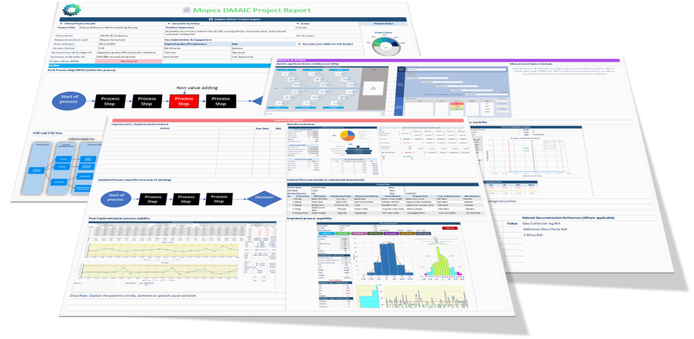 Mopex Consulting offers a variety of DMAIC tools and templates to capture baseline findings and track progress throughout a project. These are part of the client engagement process for consulting projects and stay with the client. They’re also available as stand-alone DMAIC Framework packages if you prefer to manage the project yourself. You can find them at the Mopex Store, so feel free to take a look.