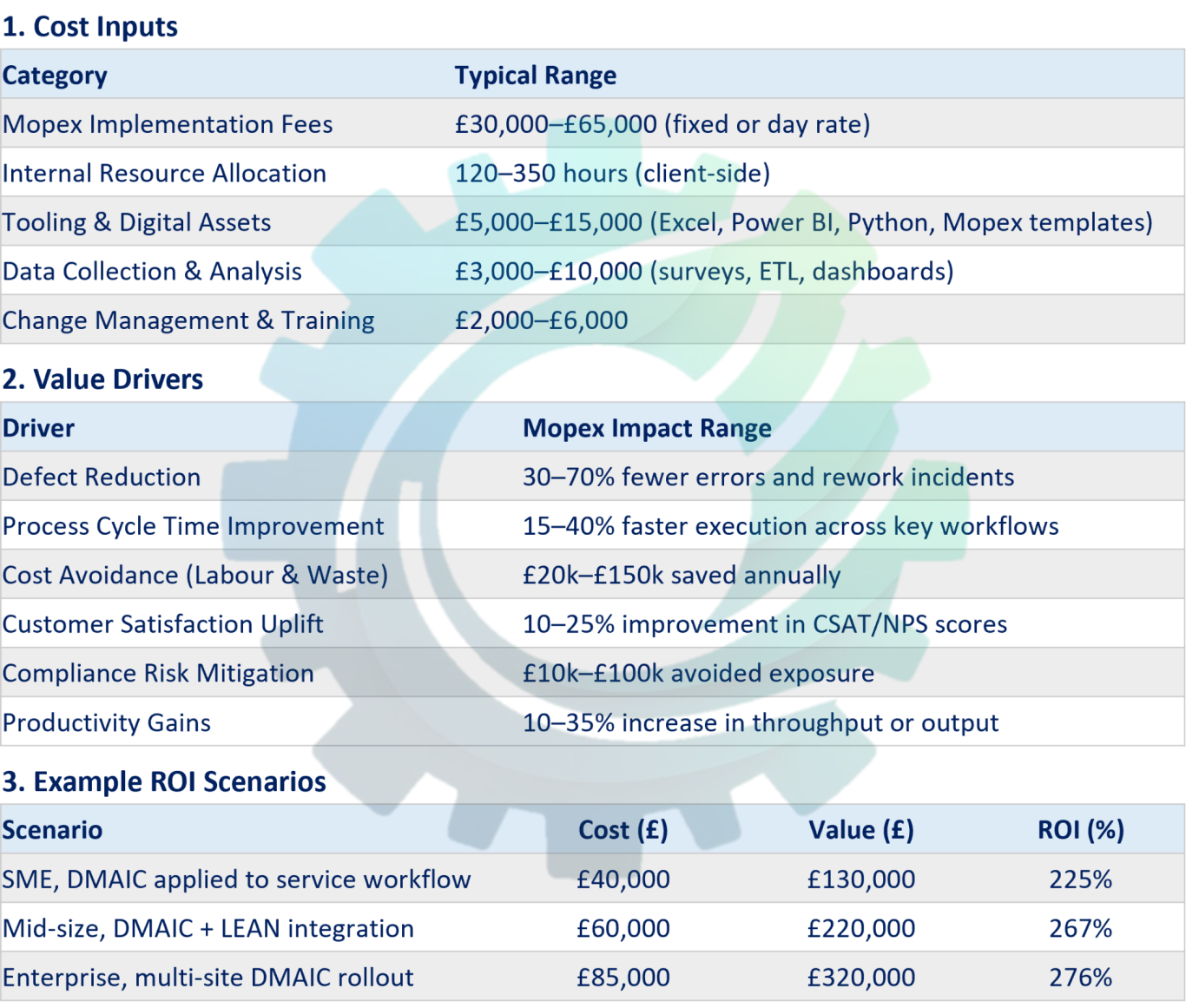 Mopex ROI Forecast Model for DMAIC Projects, it’s designed to quantify the financial and operational impact of data-driven process improvement using the DMAIC methodology.