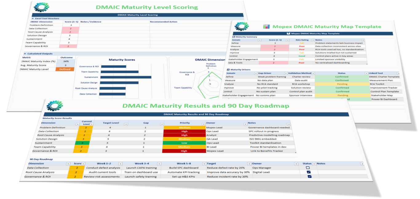 This diagnostic is a prerequisite for our projects and is ideally completed by the client first, as they have the best understanding of their operations. However, Mopex Consulting will conduct a full assessment before the project begins. You’re welcome to view and download the DMAIC 7-Dimension Diagnostic to see how you score.