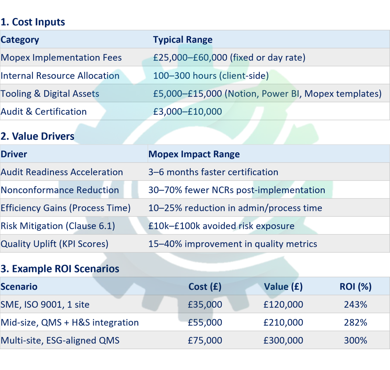 Mopex ROI Forecast Model for QMS Projects, it’s designed to quantify the financial and operational impact of implementing Mopex QMS frameworks—covering GAP analysis, compliance, and audit-readiness.