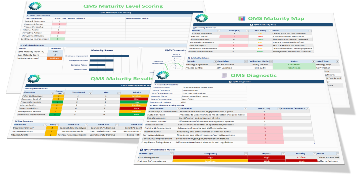 This diagnostic is a prerequisite for our projects and is ideally completed by the client first, as they have the best understanding of their operations. However, Mopex Consulting will conduct a full assessment before the project begins. You’re welcome to view and download the QMS 7-Dimension Diagnostic to see how you score.