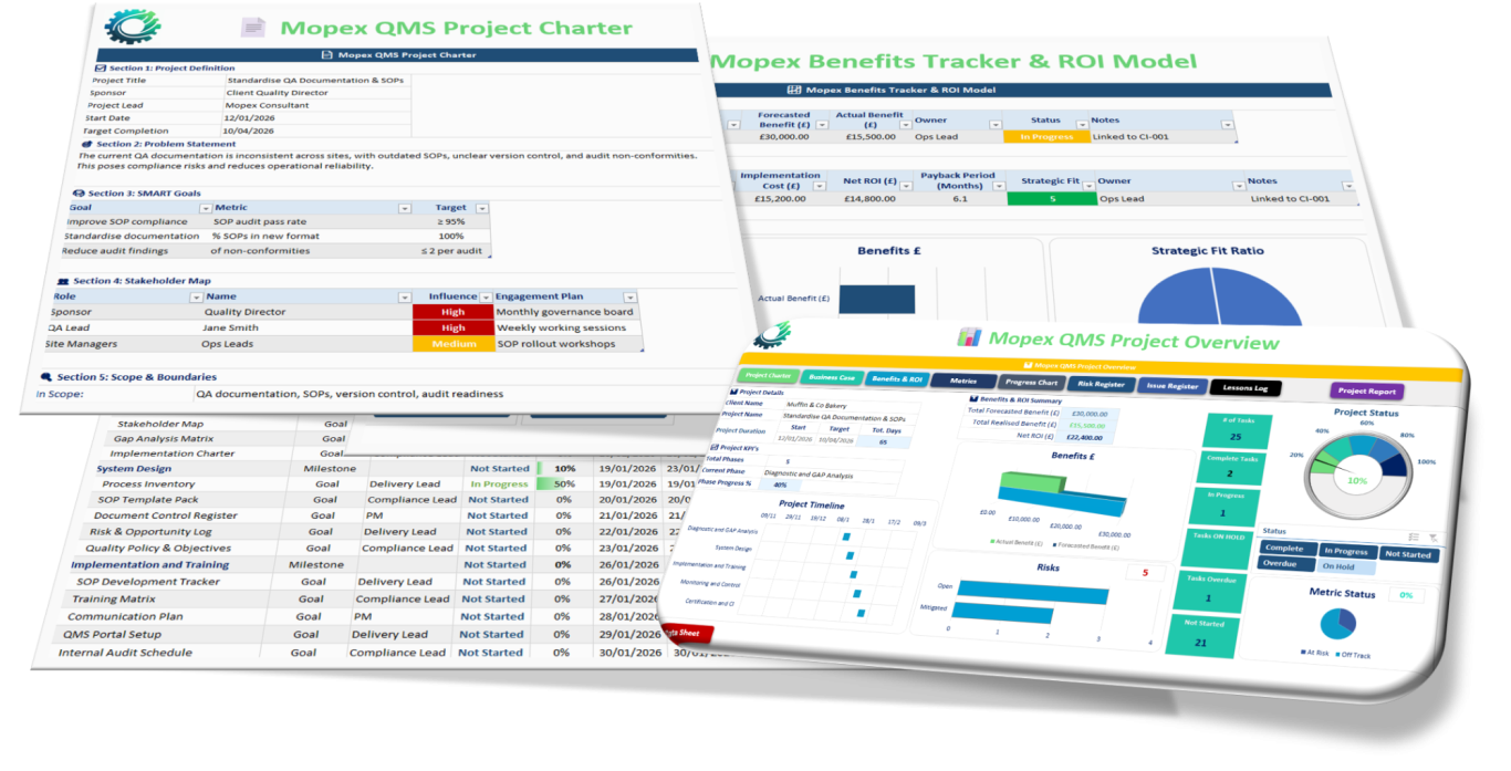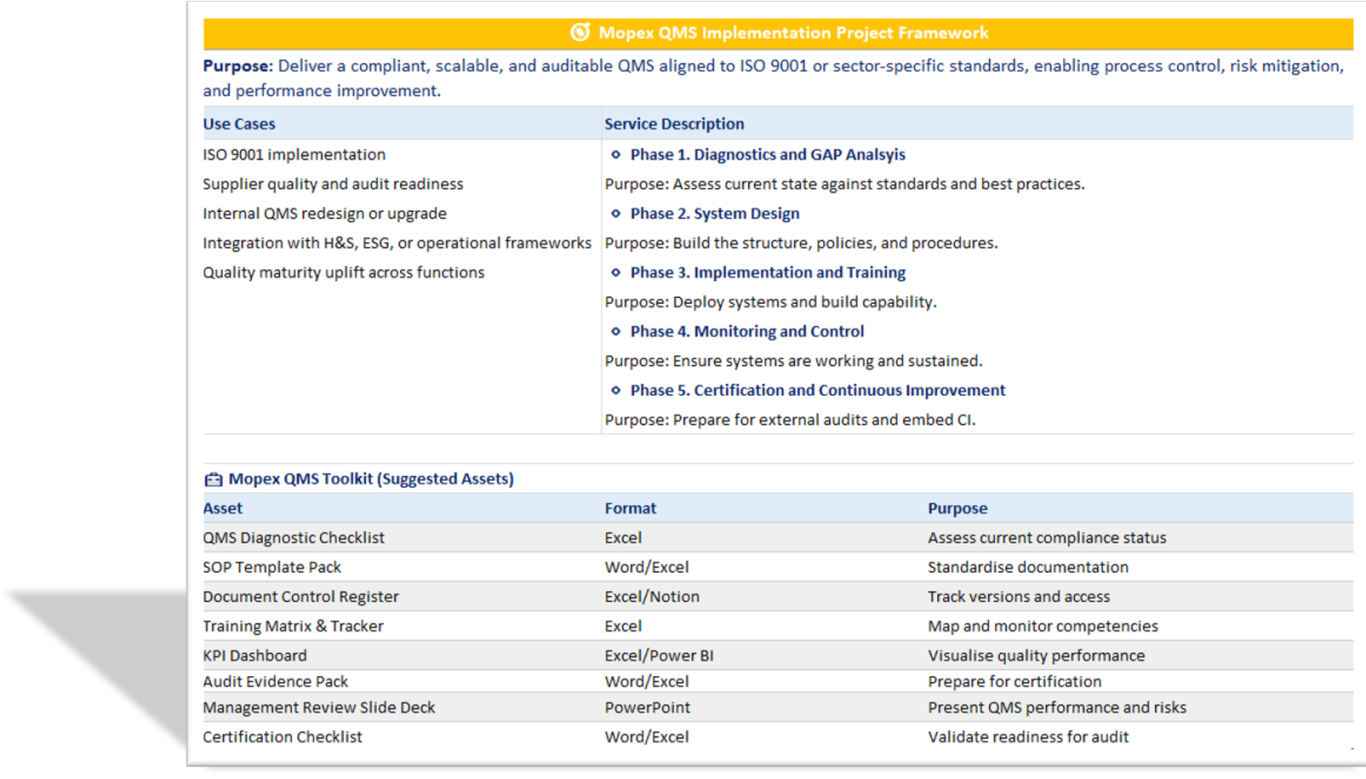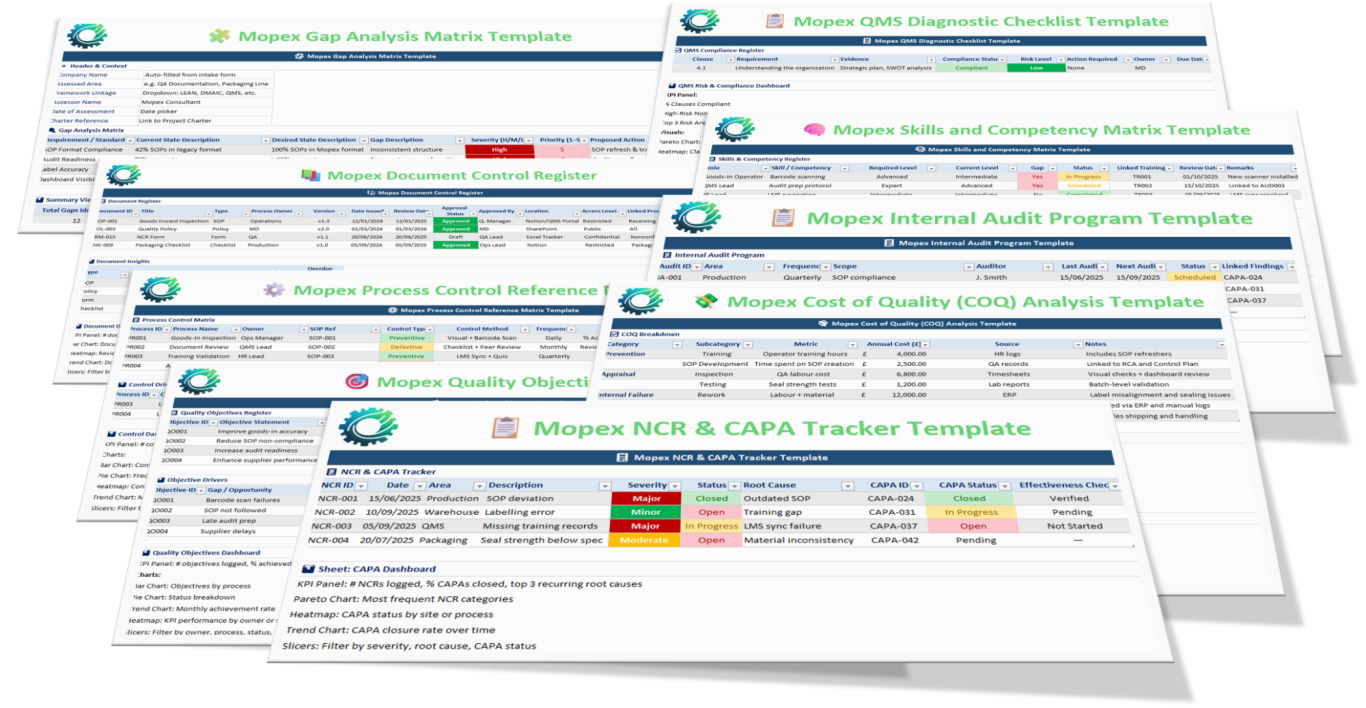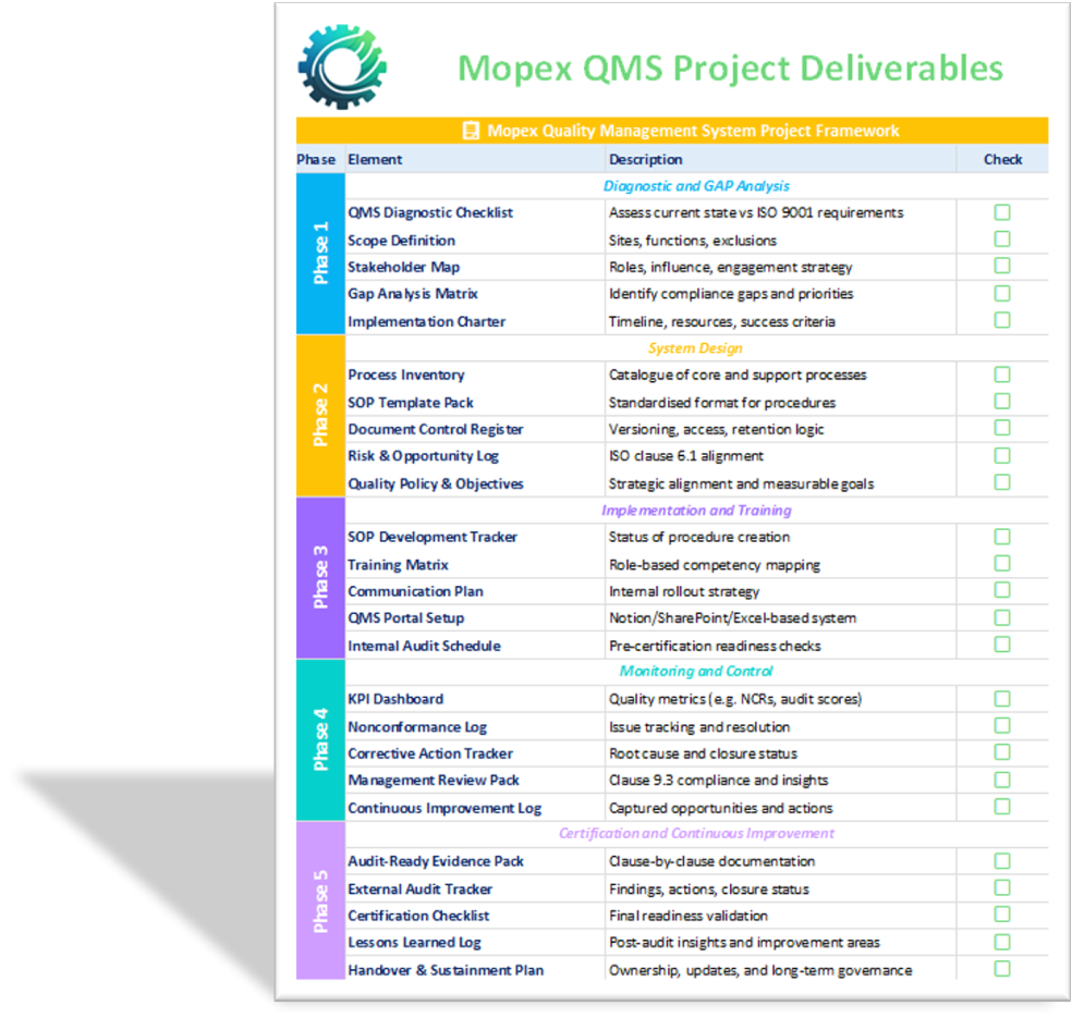 Mopex Consulting offers a variety of QMS tools and templates to capture baseline findings and track progress throughout a project. These are part of the client engagement process for consulting projects and stay with the client. They’re also available as stand-alone QMS Framework packages if you prefer to manage the project yourself. You can find them at the Mopex Store, so feel free to take a look.
