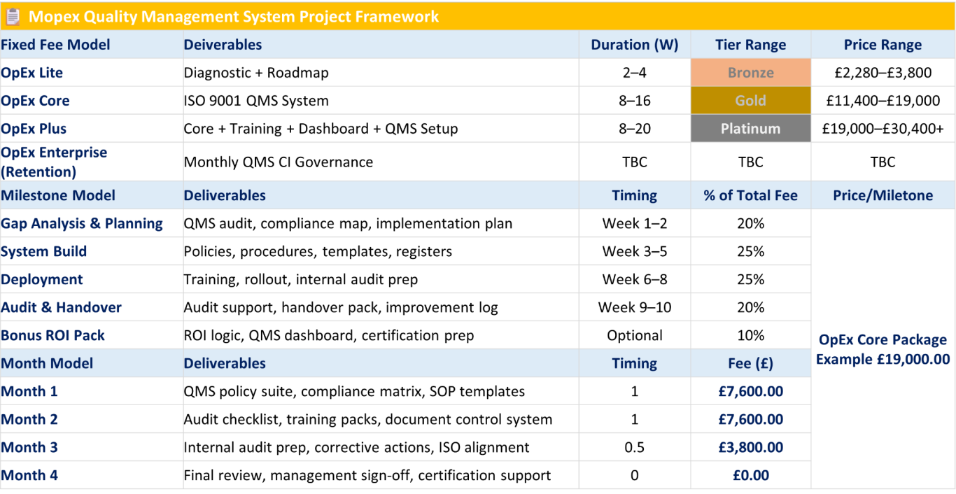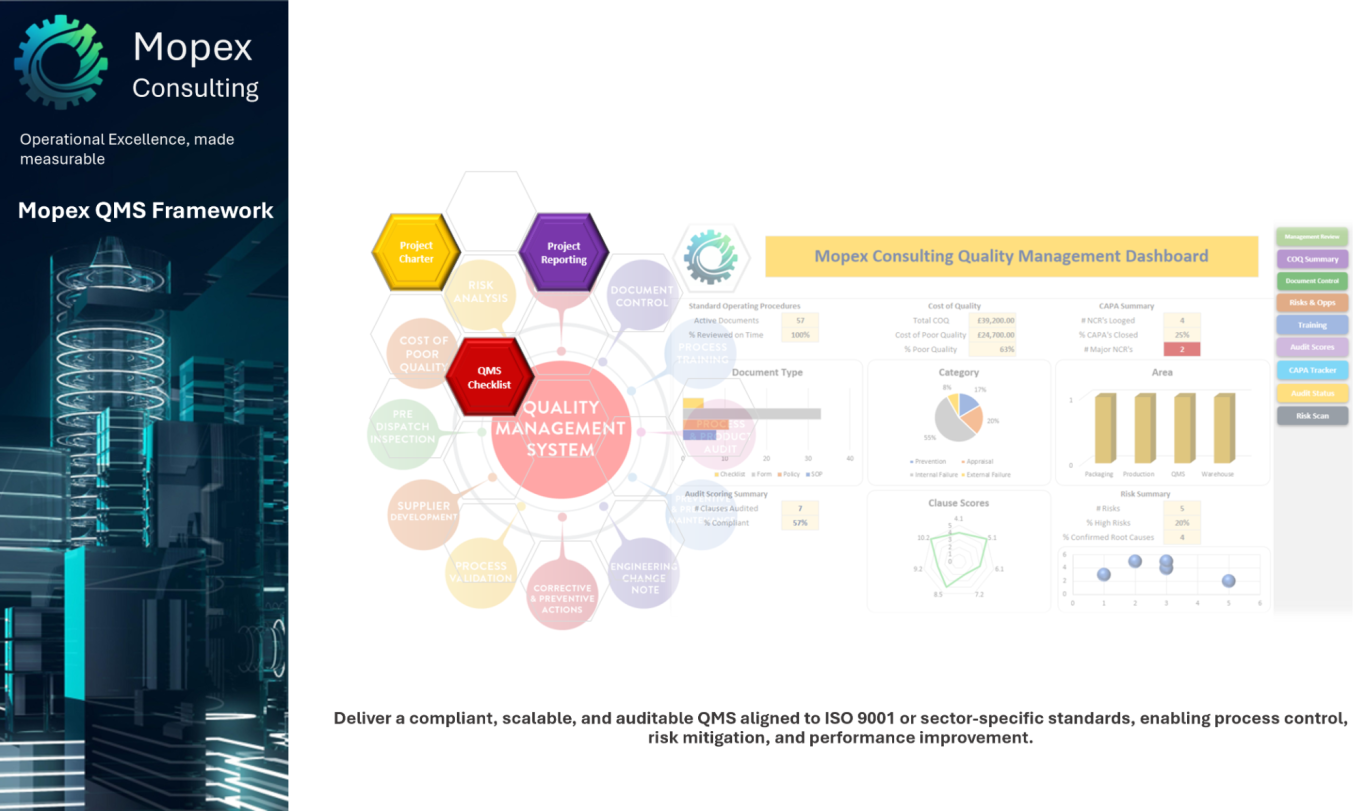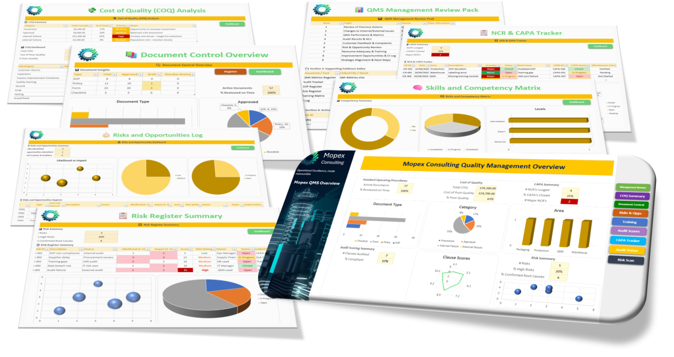Mopex Consulting offers a variety of QMS tools and templates to capture baseline findings and track progress throughout a project. These are part of the client engagement process for consulting projects and stay with the client. They’re also available as stand-alone QMS Framework packages if you prefer to manage the project yourself. You can find them at the Mopex Store, so feel free to take a look.